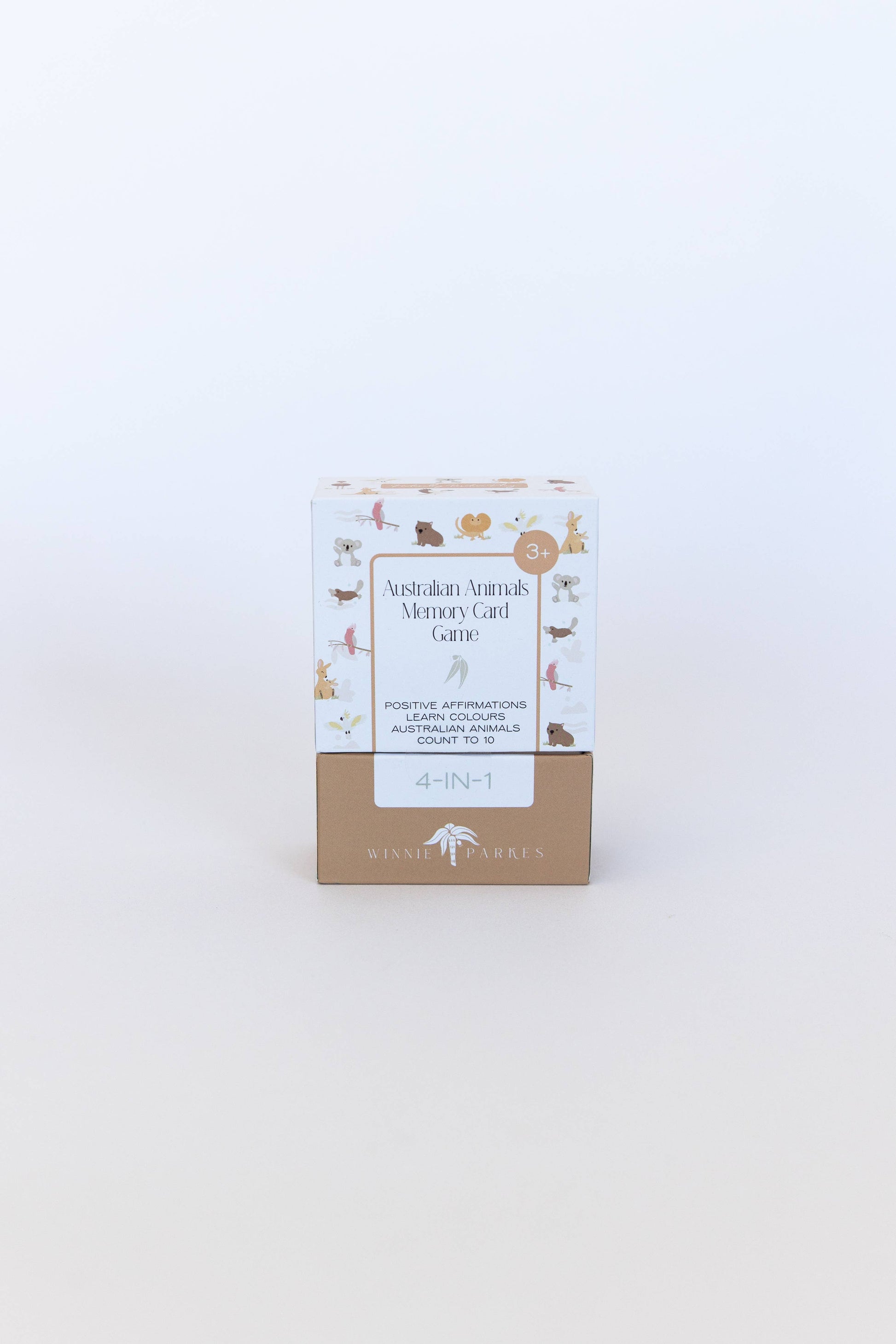 Card Game: Australian Animals, Positive Affirmations, Numbers, and Colours Engage your little one's mind and heart with our delightful 4-in-1 Memory Card Game.