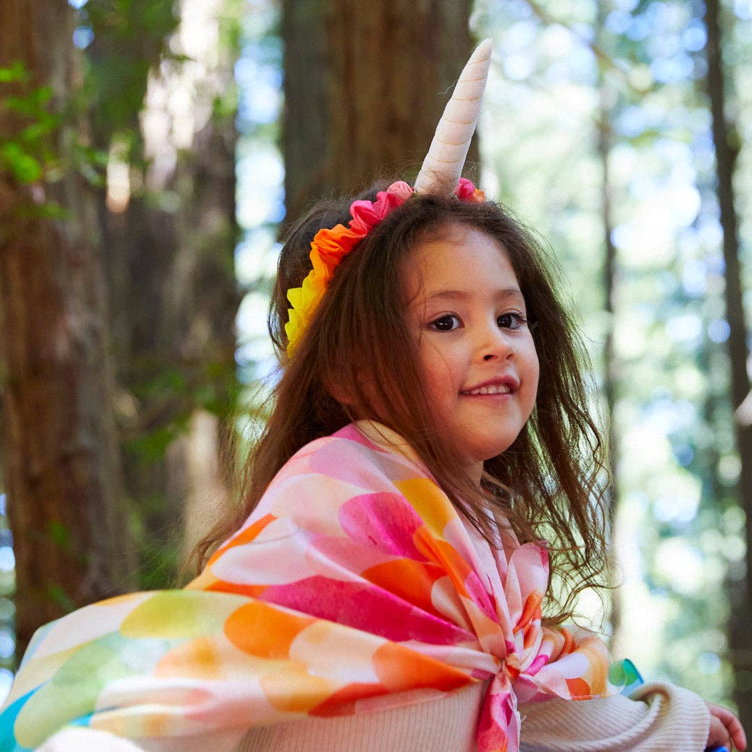 Magical Creatures Playsilks are 90 x 90 cm squares made from gorgeous, heavyweight (8 momme) 100% pure silk and printed in our limited edition Rainbow Unicorn print.