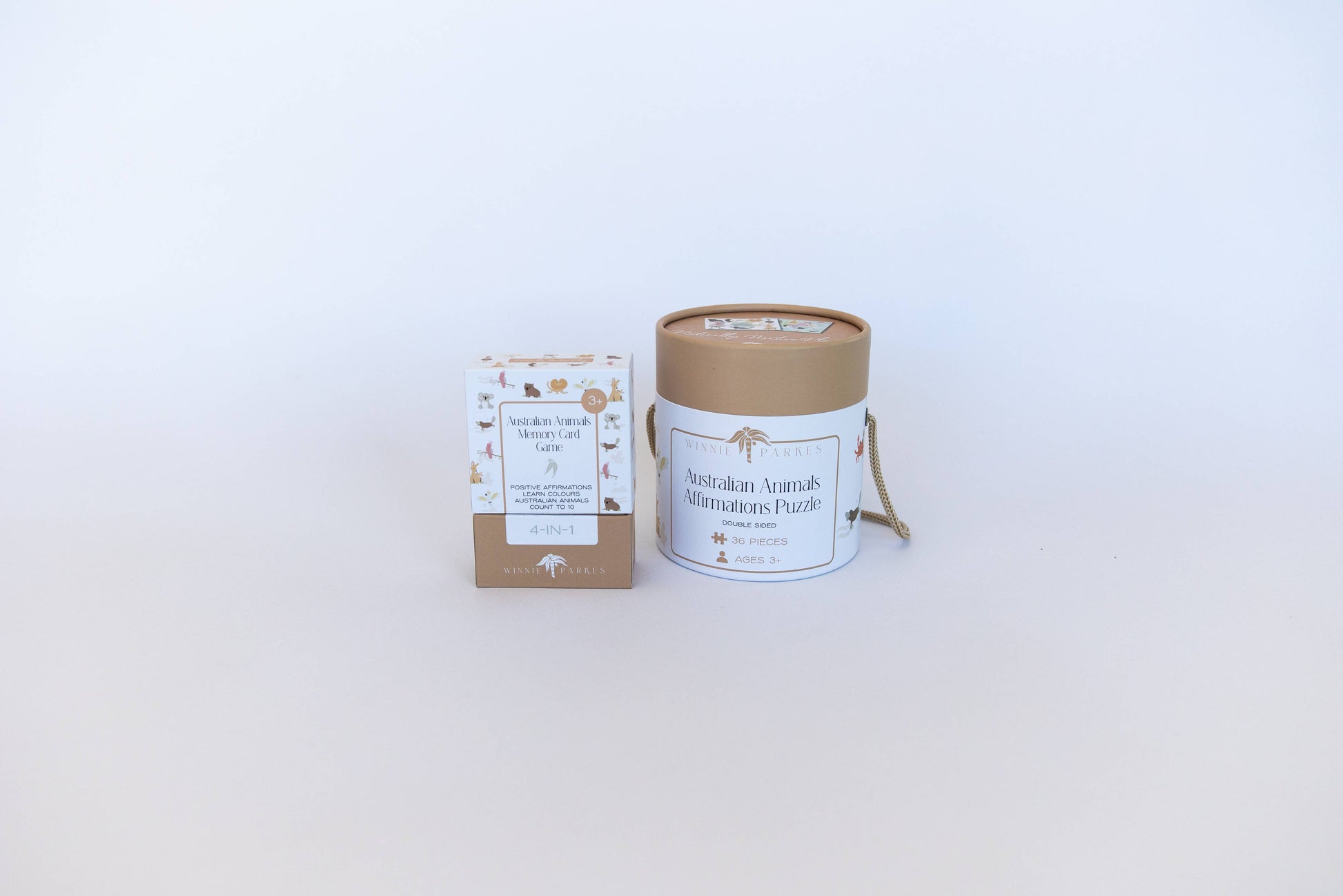 Card Game: Australian Animals, Positive Affirmations, Numbers, and Colours Engage your little one's mind and heart with our delightful 4-in-1 Memory Card Game.