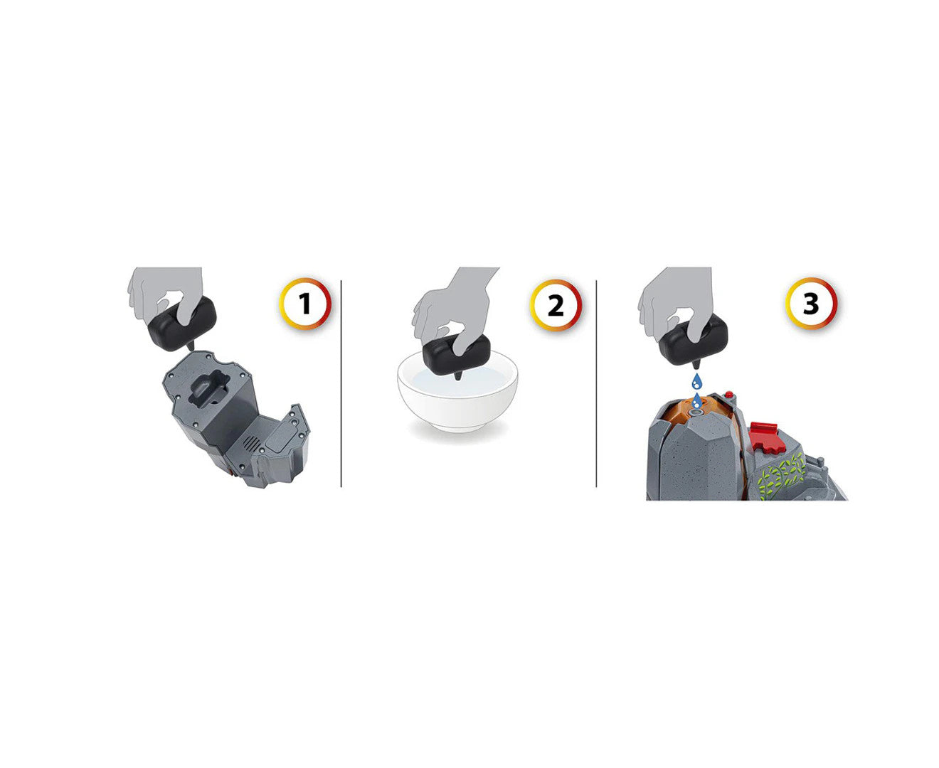 Wake the volcano by pressing the small button on its peak - activating glowing lava lights, volcano sounds and safe-to-touch steam effects that bloom from the volcano vent.