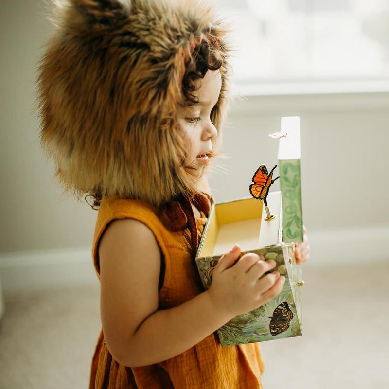 Open the lid of this gorgeous children’s music box by Enchantmints to see a beautiful monarch butterfly twirl to the tune of ‘The Isle of Capri’. A magical place to store tiny treasures, with four secret drawers, illustrated with lush green landscapes, streams and butterflies in soft watercolours , this music box will be cherished for many years.