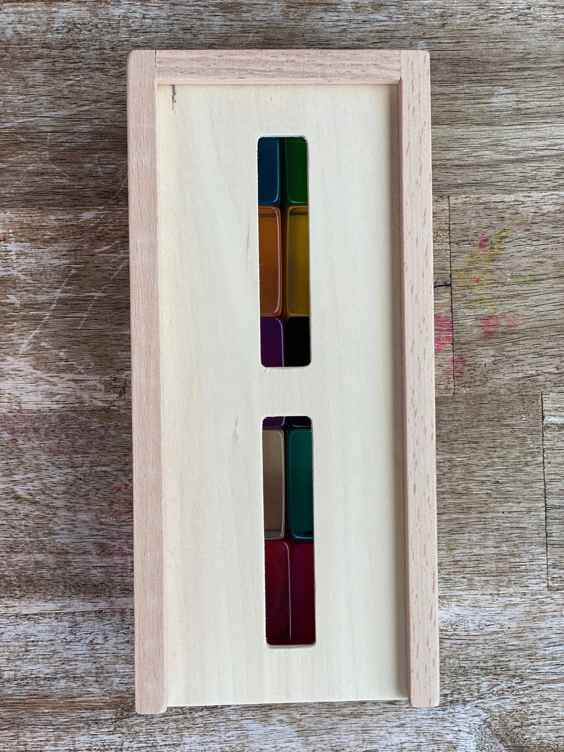 Cubes measure 3.5cm squared and come in a wooden storage box with lid.